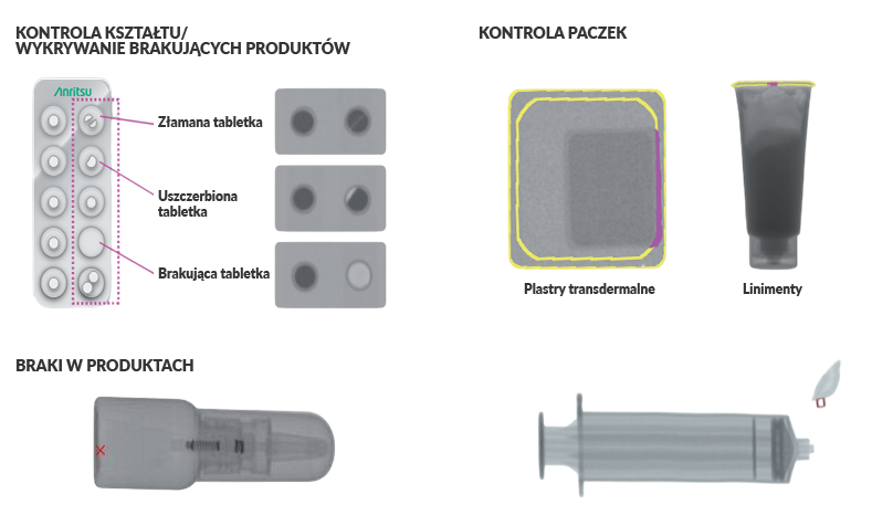 - detekcja zanieczyszczeń w tabletkach - mimo licznych kontroli na etapie produkcji, blistry mogą zawierać uszkodzone, wyszczerbione lub brakujące tabletki, a także drobne zanieczyszczenia metalowe gromadzące się w miejscach uszczelnienia.