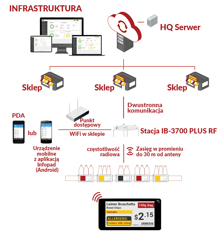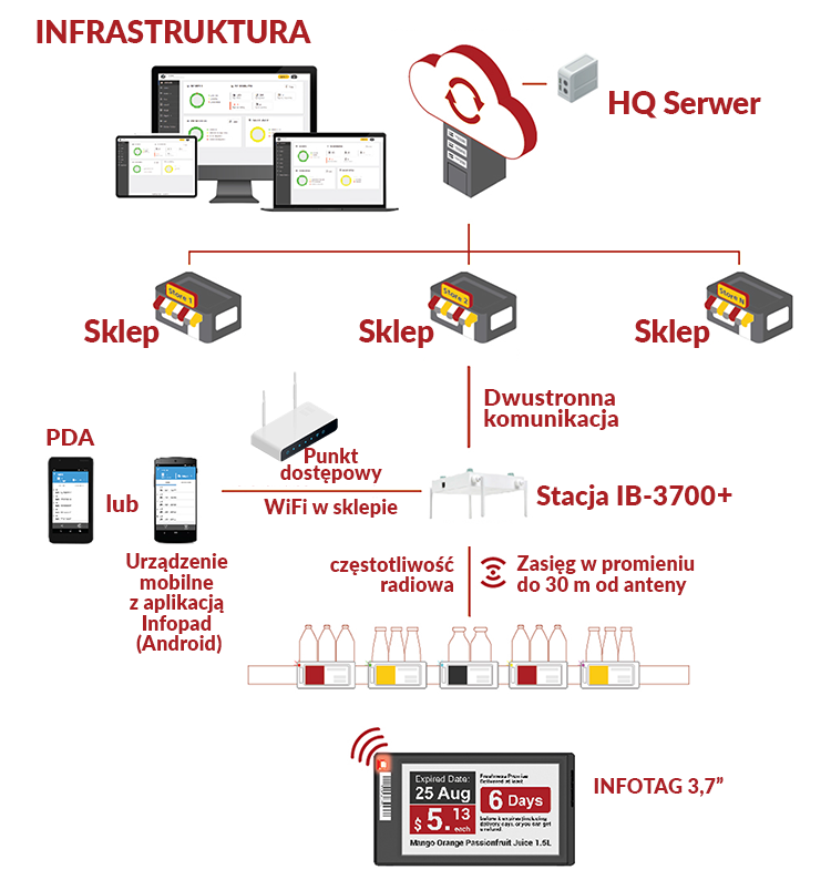 Transfer danych do cenówek ESL odbywa się bezprzewodowo (za pomocą łączności WiFi). Aktualizacja danych w systemie T@POP odbywa się za pomocą plików w formacie *.CSV. System T@POP po pobraniu pliku CSV aktualizuje bazę danych i automatycznie rozsyła zmiany do InfoTagów (cenówek elektronicznych). Gwarantuje to, że cena i informacje o produktach będą aktualizowane na bieżąco bez rozbieżności w cenach. Wpływa to na zmniejszenie kosztów związanych z błędami nieścisłości cenowych oraz na poprawę wydajności i efektywności dzięki wyeliminowaniu czasochłonnych zadań t.j. drukowanie, laminowanie tradycyjnych cenówek papierowych. Infrastrukturę systemu obrazuje grafika poniżej: